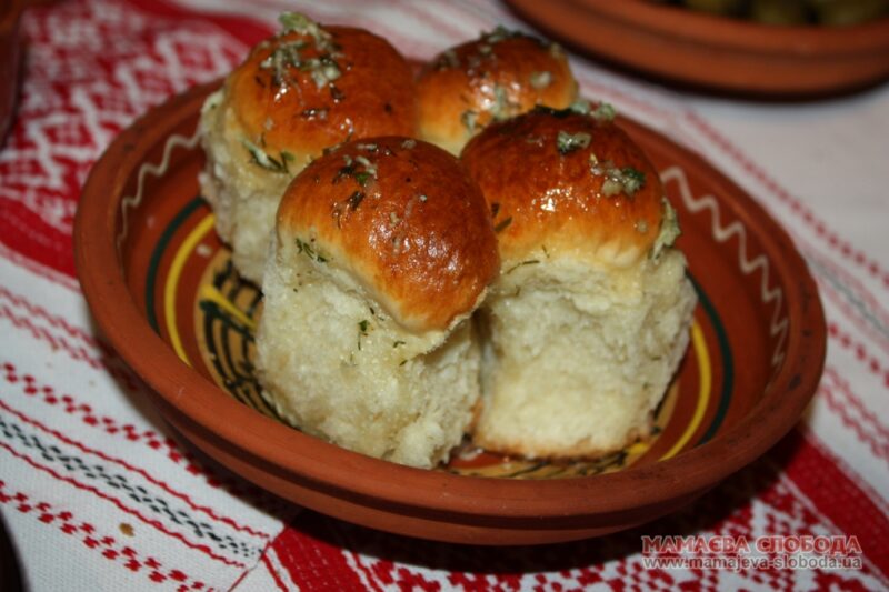 Готові пампушки відразу ж змастіть часниковою сумішшю.