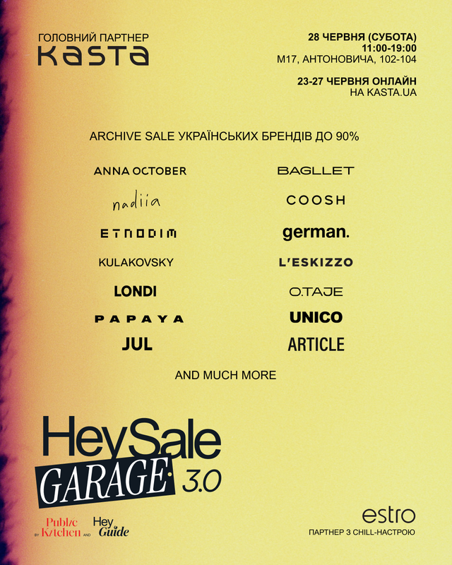 Hey Garage Sale 3.0 — маркет від агенції Public Kitchen та курованого гіда Києвом Hey Guide, який вже втретє збирає улюблені бренди у Києві. Цього разу поповнити свій гардероб можна буде речами від Estro, COOSH, Anna October, Etnodim, LONDI, german, JUL та багатьох інших. Кожен зможе придбати бестселери брендів та ексклюзивні айтеми зі знижками до -90%.