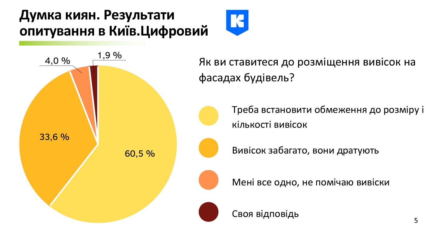 Проєкт регуляторного акту “Про внесення змін до Порядку розміщення вивісок у місті Києві”, представлений улітку, пройшов етап публічних обговорень перед ухваленням на пленарному засіданні Київради. Рішення було прийнято з урахуванням думки киян, представників бізнесу та спираючись на практичний досвід використання чинного Порядку розміщення вивісок. Детальніше дивіться у pdf-презентації.