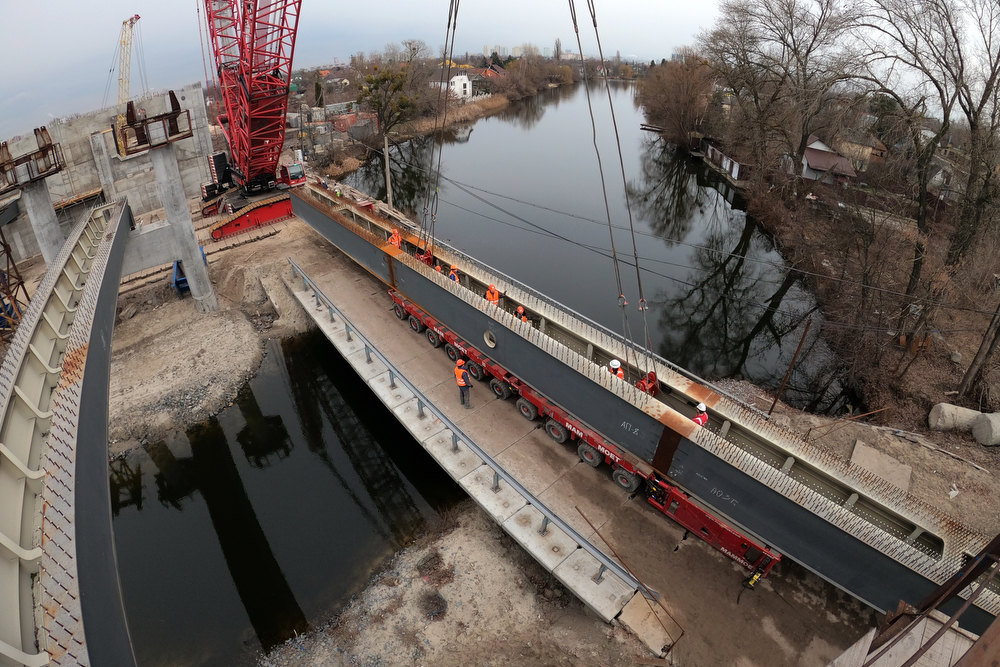 «Добудова Подільсько-Воскресенського мостового переходу – одне з головних завдань на цей рік для міської влади. Роботи на об’єкті тривають за графіком. Сьогодні будівельники встановили перші балки для майбутньої частини мостового переходу над Русанівським озером. Кожна з цих балок важить майже 70 тонн. Підіймають їх за допомогою надпотужних кранів, а контролюють процес фахівці з Нідерландів”, – зазначив мер.