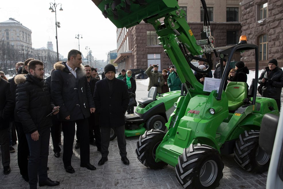 «Київзеленбуд» презентував 9 одиниць нової техніки для прибирання та звору сміття, після чого Віталій Кличко особисто випробував нову техніку в дії та проїхався на підмітальній машині Хрещатиком.