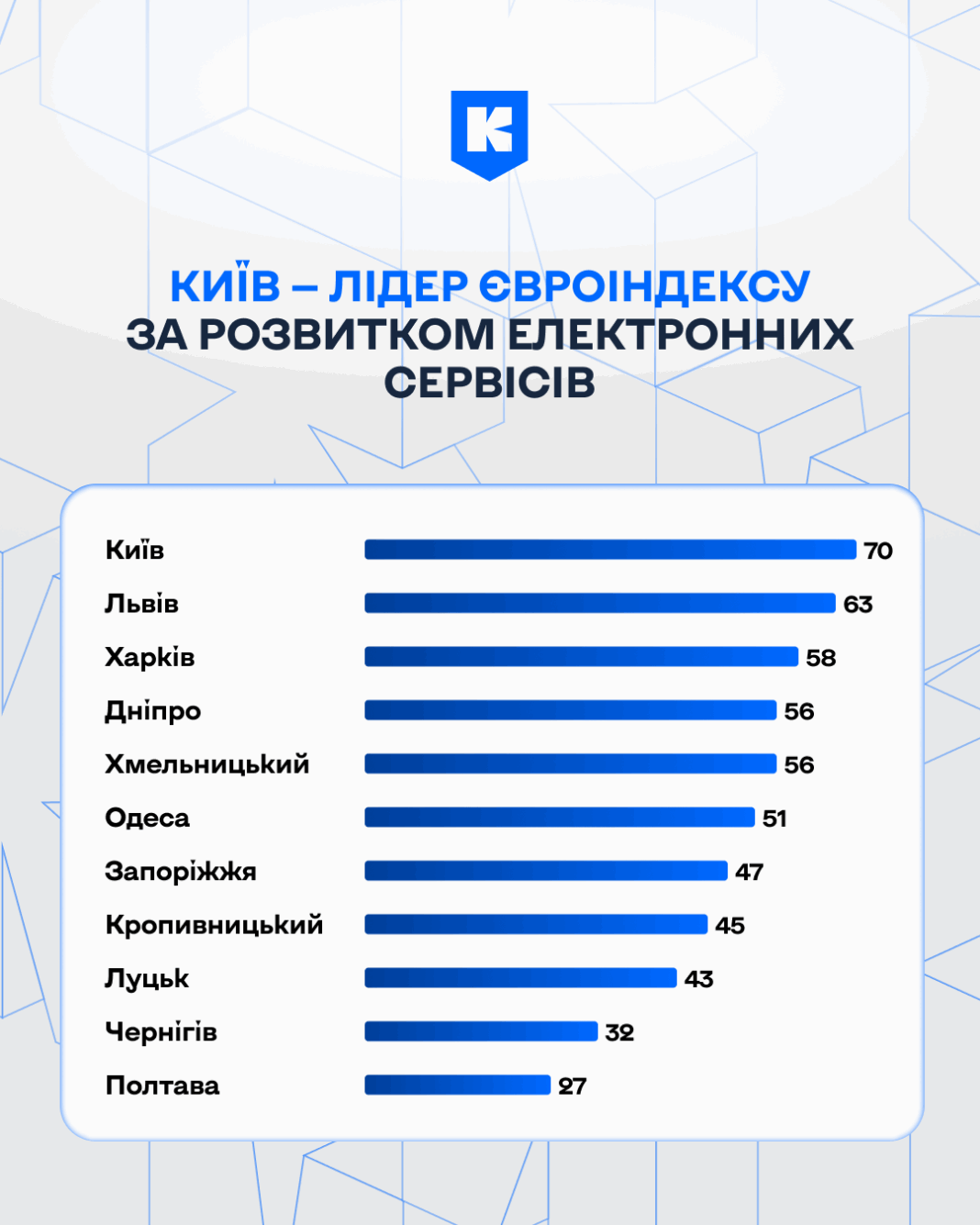 За результатами дослідження Київ посів 1-ше місце, набравши 70 зі 100 можливих балів. Це найвищий показник серед усіх міст, що брали участь у пілоті. Такий результат став підтвердженням системної та тривалої роботи столиці у сфері цифрової трансформації.