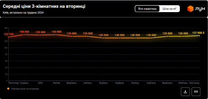 Середня ціна 3-кімнатної квартири на вторинному ринку столиці у грудні 2024 року складає 137 тисяч доларів США.
