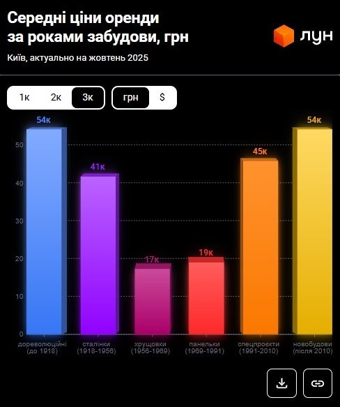 (Інфографіка: Середні ціни оренди 2-кімнатних квартир в Києві за роками забудови – жовтень 2025, ЛУН Статистика)