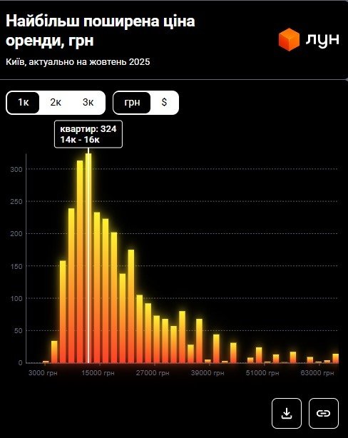- За даними ЛУН Статистика, найбільш поширена ціна оренди – 14 000–16 000 грн (на цей діапазон припадає найбільше пропозицій — 324).
