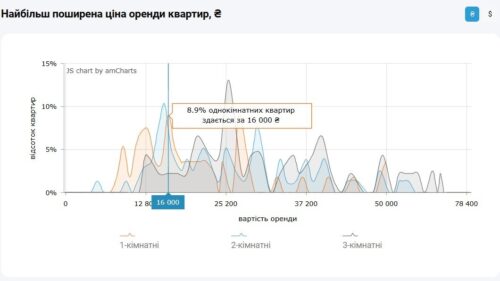 - За даними M2bomber, найбільш поширена ціна – 16 000 грн (8.9% пропозицій). Такий самий відсоток квартир пропонують за ціною 27 000 грн.