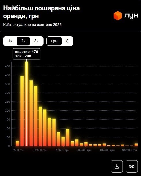 - За даними ЛУН Статистика, найбільш поширена ціна оренди – 15 000 – 20 000 грн (476 пропозицій).