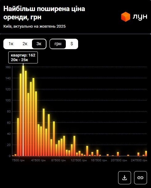 (Інфографіка: Найбільш поширена ціна оренди 3-кімнатних квартир в Києві станом на жовтень 2025, ЛУН Статистика/m2bomber)