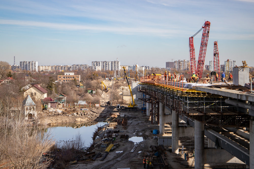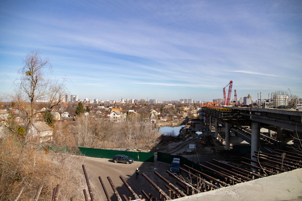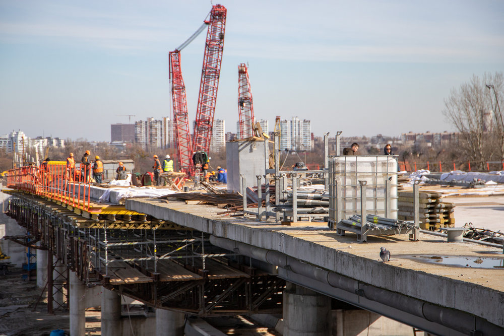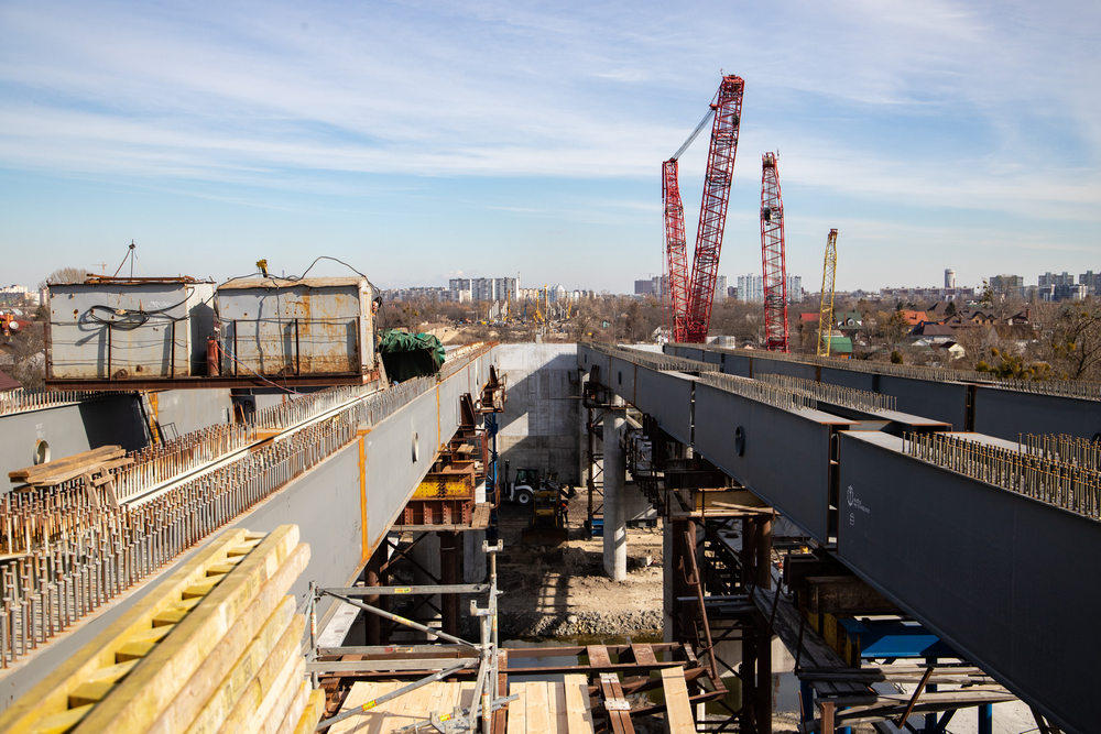 «Як ви бачите, ми суттєво просунулися в напрямку Троєщини. Кілька тижнів тому фахівці встановили 70-тонні балки нової частини мостового переходу через Русанівське озеро. Робили це за допомогою сучасних надпотужних домкратів, що вже показали свою ефективність на будівництві Шулявського шляхопроводу. Також розпочали встановлення на цих балках бетонних плит та їх укріплення. Нам залишилося ще метрів 200, і ми вийдемо на роботи з будівництва з’їздів. До речі, вже триває облаштування насипу там, де буде з’їзд із мосту на лівому березі», – наголосив Віталій Кличко.