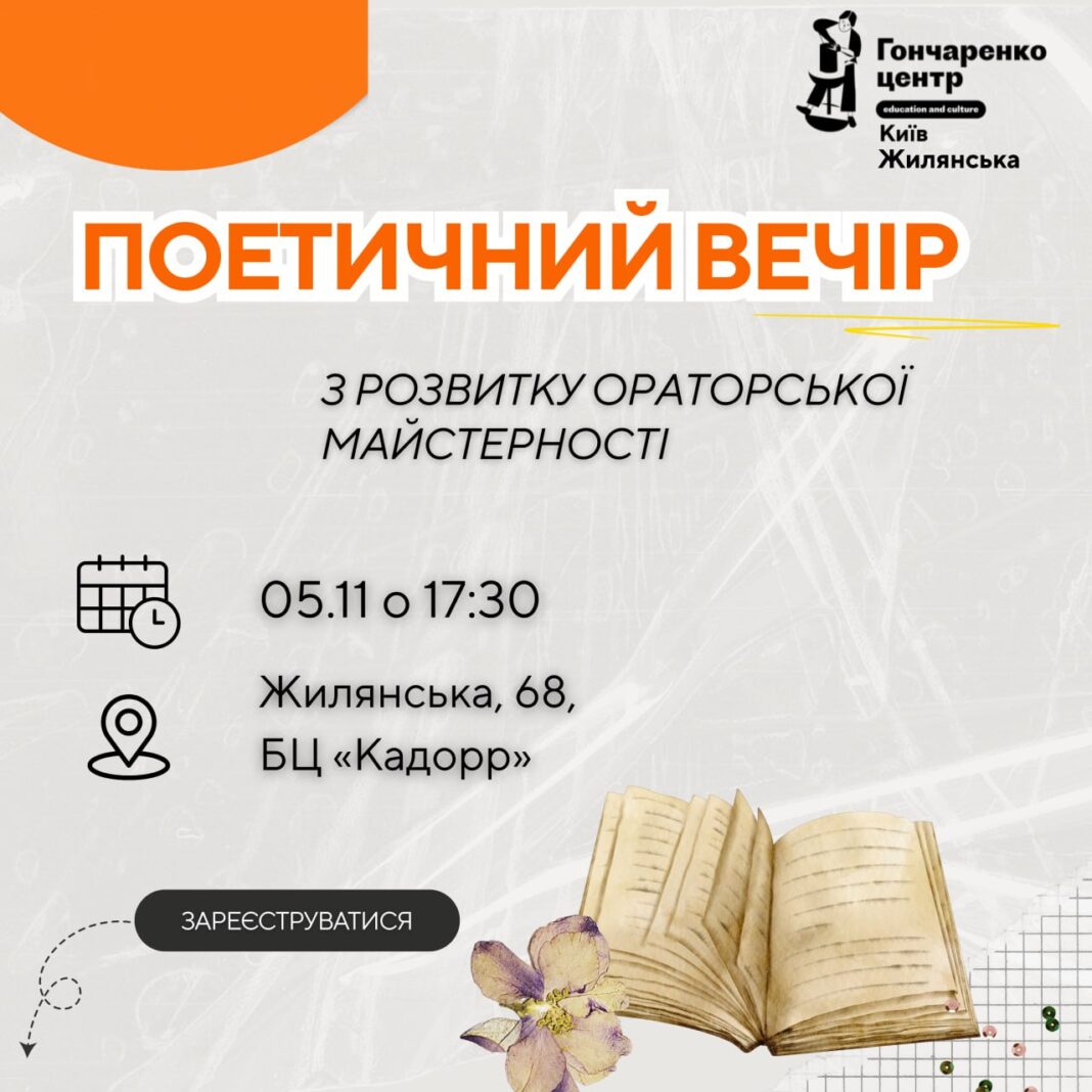Про це повідомили організатори — команда освітньо-культурного простору Гончаренко центр Київ. У команді кажуть: цей тренінг — для всіх, хто хоче навчитися виступати перед публікою, декламувати вірші й звучати переконливо.