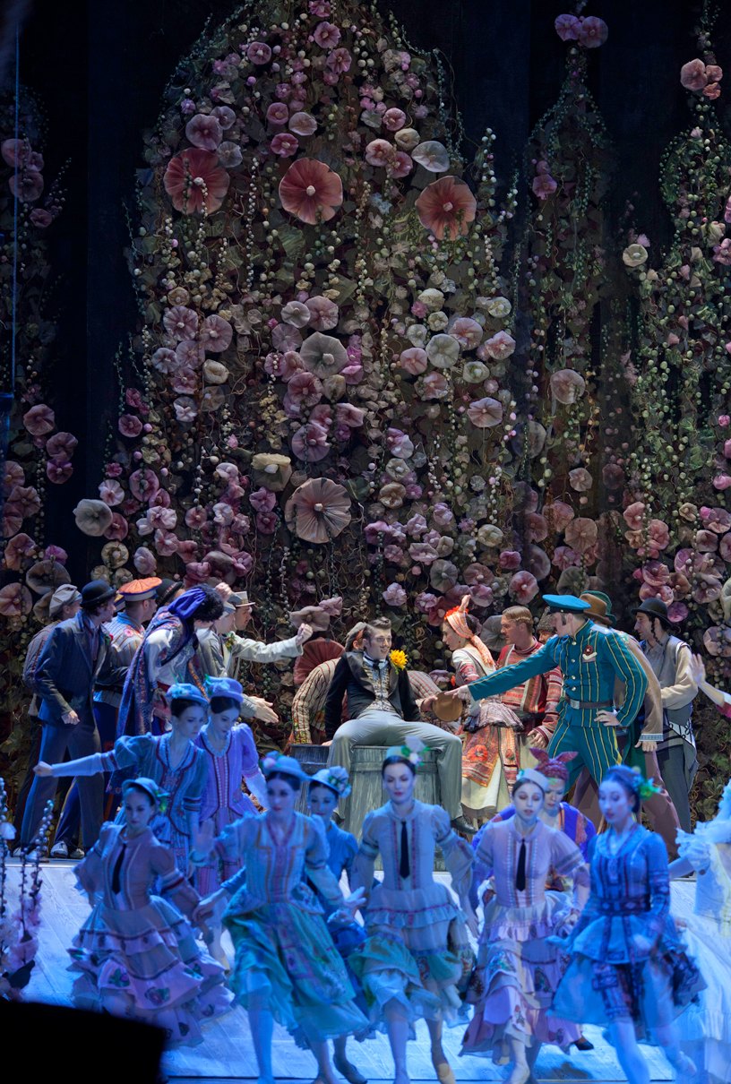 У декораціях, де головним символом стала Андріївська церква, крізь яку проростають мальви (втім, як і крізь все, що було на сцені), тонкий натяк на провінційність. Проте, саме велика кількість квітів додала всьому сценічному дійству легкості та святковості.
